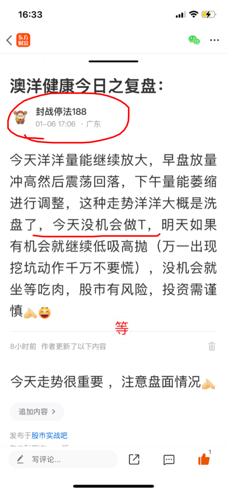 $澳洋健康(SZ002172)$ 今天洋洋量能同样不错,主力资金也显示流入状态,股价在生命线之间徘徊,今天同样没机会做T,明天如果有挖坑动作就把仓位打满(挖坑后冲高就T),开盘后冲高就清仓等回落买回
