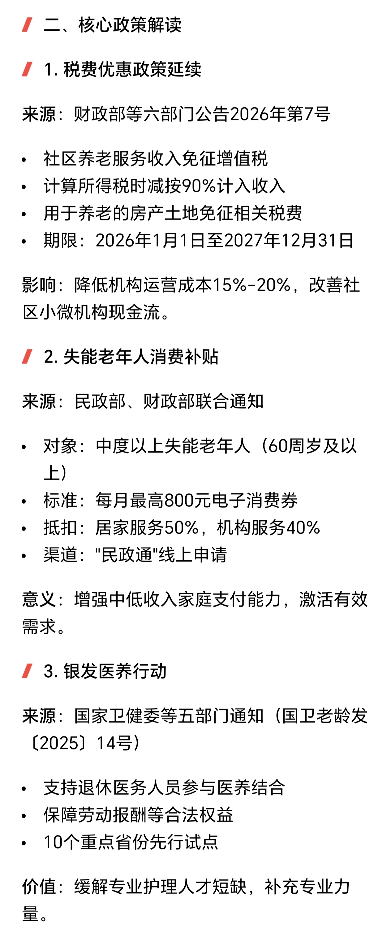 2026开年,国家连续推出税费优惠,消费补贴,医养结合三项关键政策,形成系统性支持组合拳。标志着银发经济进入高质量发展新阶段,产业发展进入关键窗口期。