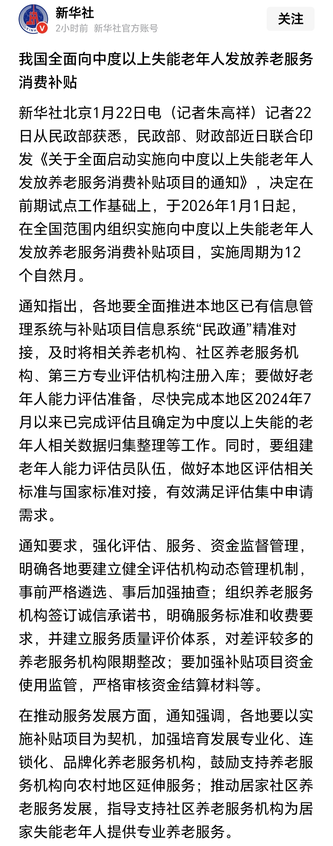 我国全面向中度以上失能老年人发放养老服务消费补贴!