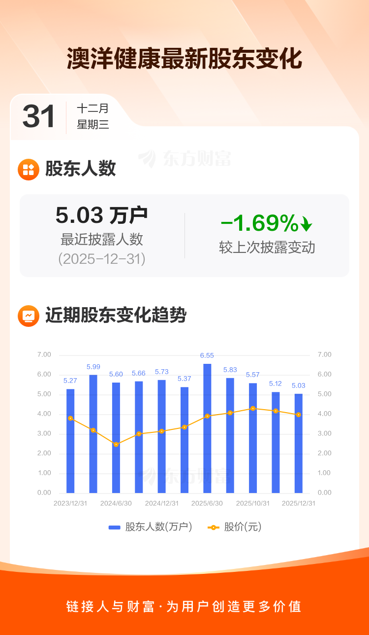 澳洋健康最新披露数据显示,截至12月31日公司股东户数为5.03万户,较上期(2025年12月19日)减少865户,降幅为1.69%。户均持有流通股数量由上期的1.49万股上升至1.52万股,户均持股金额由上期的6.22万元减少至6.04万元。