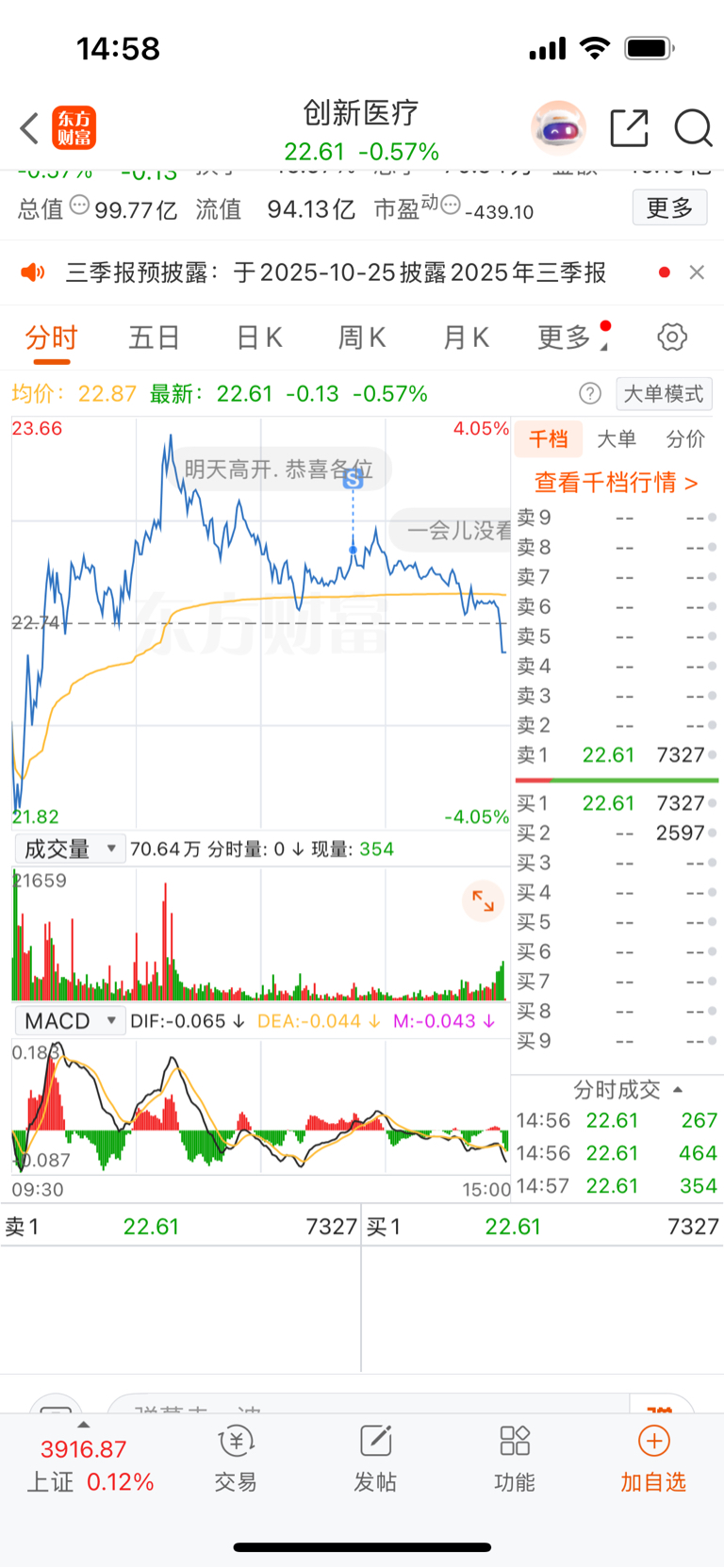 $创新医疗(SZ002173)$ 下午走太弱了,就走了,我想22.8左右接回来的,没想到突然来这一下