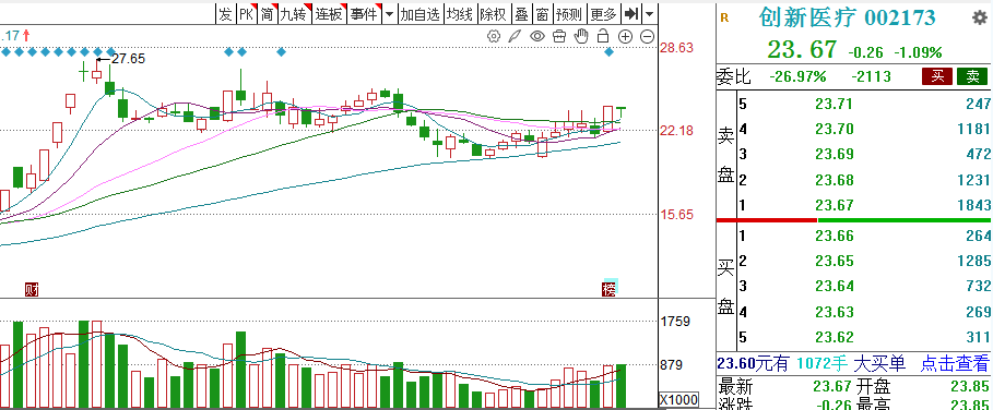 创新医疗作为脑机接口领域核心标的,市场辨识度较高,旗下拥有建华医院等四家医疗机构,同时参股杭州博灵布局脑机接口业务。当前脑机接口技术已进入临床阶段,行业未来发展空间广阔。此前龙虎榜显示,三家机构与市场活跃资金大幅流入,今日该股未出现冲高,短期资金在场内整理的可能性较大,理论上存在补涨动力。技术面来看,均线呈多头排列,早盘低开低走符合短期震荡预期,小幅回落后为较好布局时机,今日整体呈现震荡上行趋势。