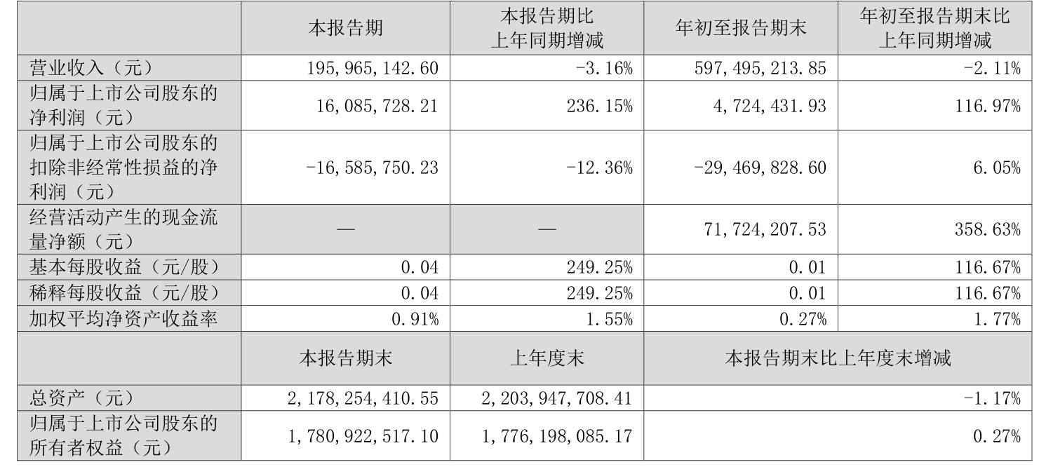 中证智能财讯创新医疗(002173)10月25日披露2025年第三季度报告。前三季度公司实现营业总收入5.97亿元,同比下降2.11%;归母净利润472.44万元,同比扭亏;扣非净利润亏损2946.98万元,上年同期亏损3136.87万元;经营活动产生的现金流量净额为7172.42万元,同比增长358.63%;报告期内,创新医疗基本每股收益为0.01元,加权平均净资产收益率为0.27%。