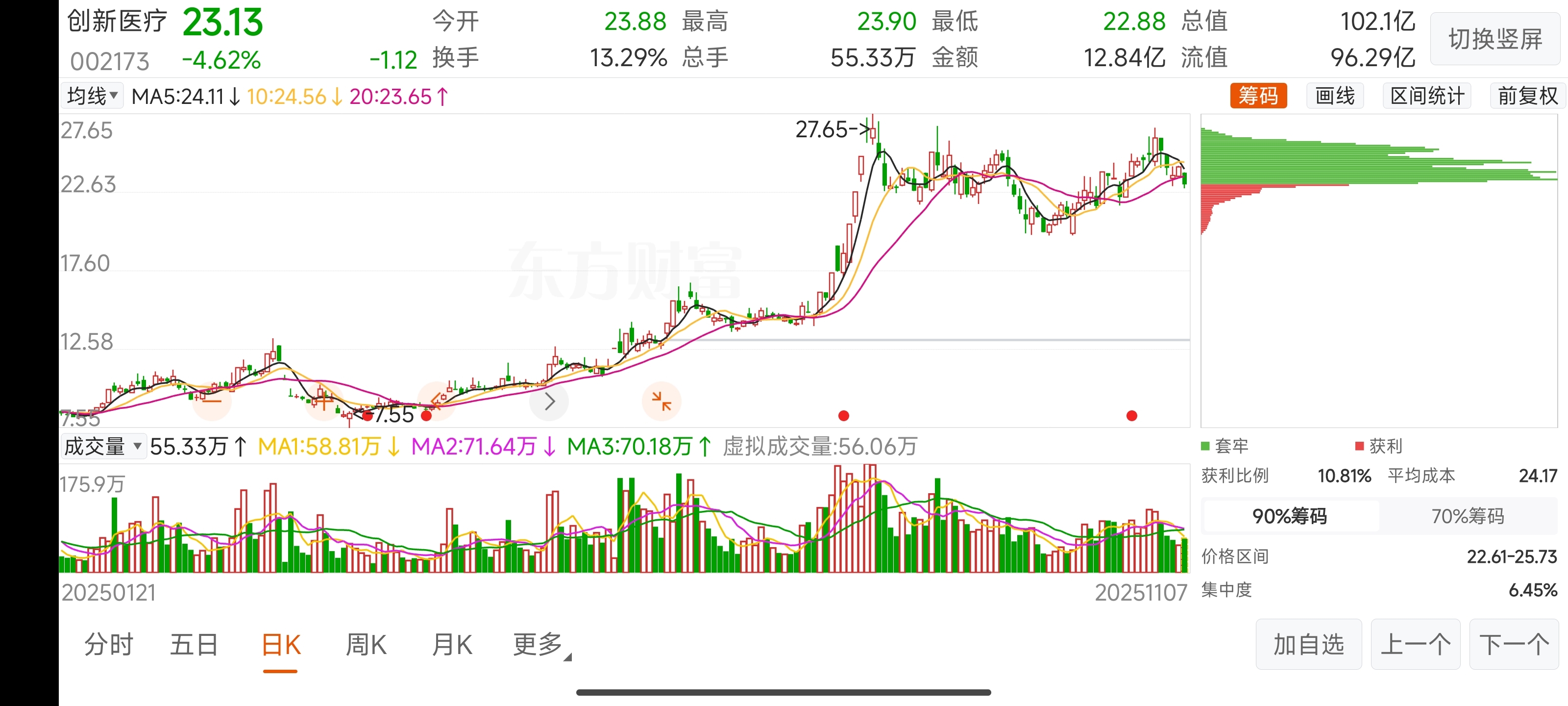 $创新医疗(SZ002173)$ 近期公众投资者筹码成本24.22元左右,下跌5%,23.08左右,再跌5%到达21.80,21.80我再来,买半仓