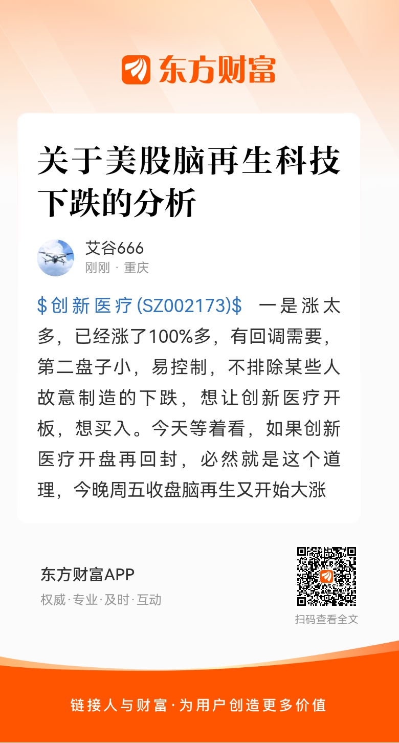 $创新医疗(SZ002173)$ 一是涨太多,已经涨了100%多,有回调需要,第二盘子小,易控制,不排除某些人故意制造的下跌,想让创新医疗开板,想买入。今天等着看,如果创新医疗开盘再回封,必然就是这个道理,今晚周五收盘脑再生又开始大涨