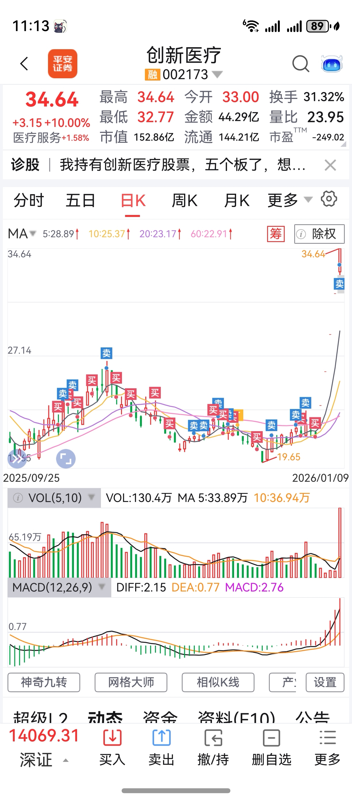 $创新医疗(SZ002173)$ 早上卖掉一部分了。