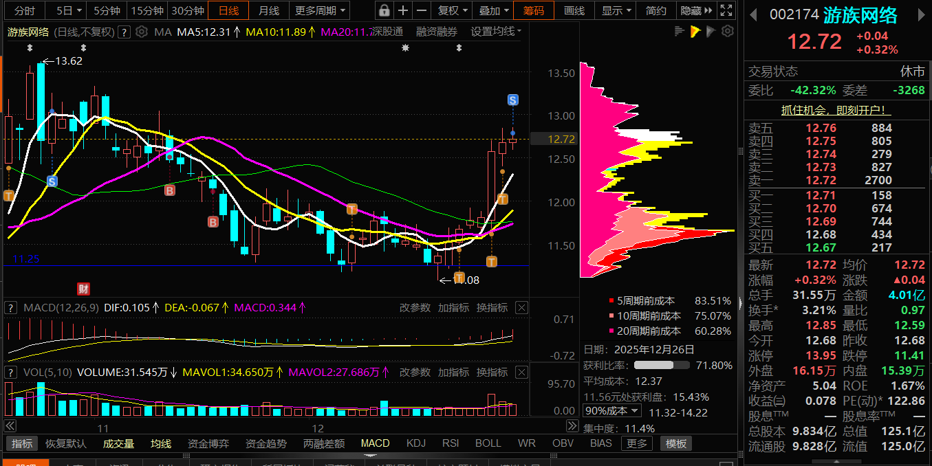 周五上午出了连底仓都没留,原计划是做T的(这股振幅偏大适合做T),就因下午大盘和个股那波快速跳水让我没敢再接进去,还以为出黑天鹅了。回头看看这股从11块起来后筹码集中度反而更高了,看来应该都是短期获利盘和套牢盘走的。游族的基本面还是很健康的,真的看好他,后市可期,下周希望能给个机会踩下5日线我好再进去。