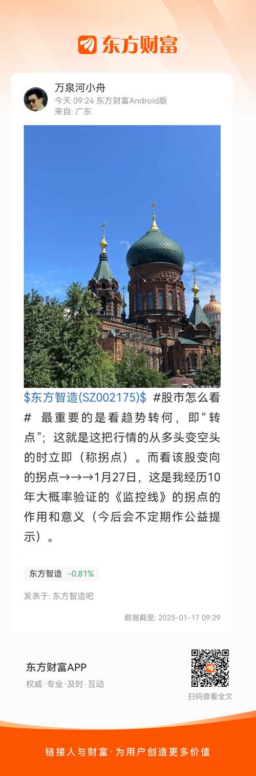 $东方智造(SZ002175)$ #股市怎么看# 最重要的是看趋势转何,即“转点”;这就是这把行情的从多头变空头的时立即(称拐点)。而看该股变向的拐点→→→1月27日,这是我经历10年大概率验证的《监控线》的拐点的作用和意义(今后会不定期作公益提示)。