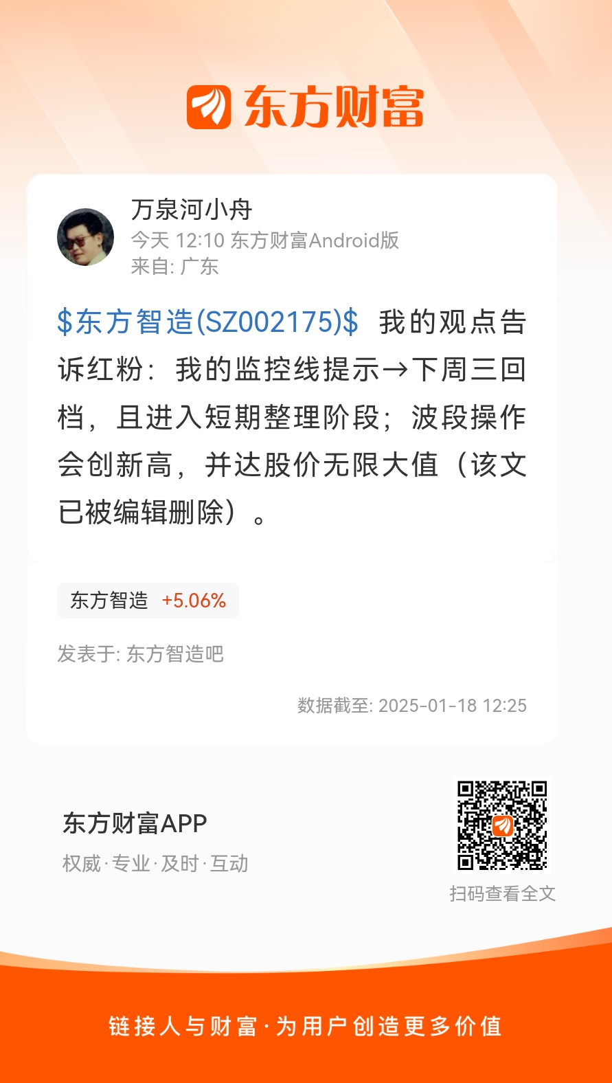 $东方智造(SZ002175)$ 我的观点告诉红粉:我的监控线提示→下周三回档,且进入短期整理阶段;波段操作会创新高,并达股价无限大值(该文已被编辑删除)。