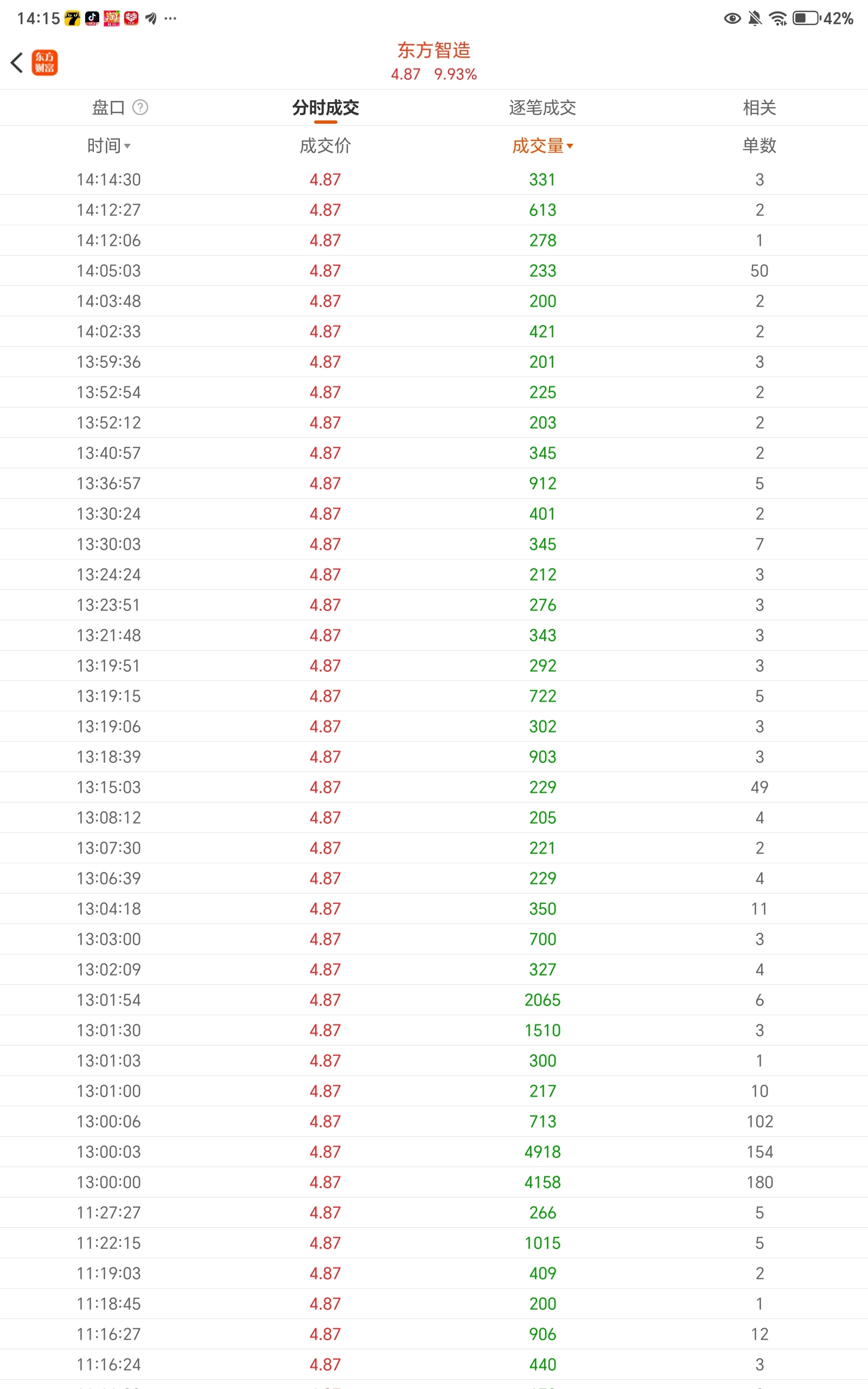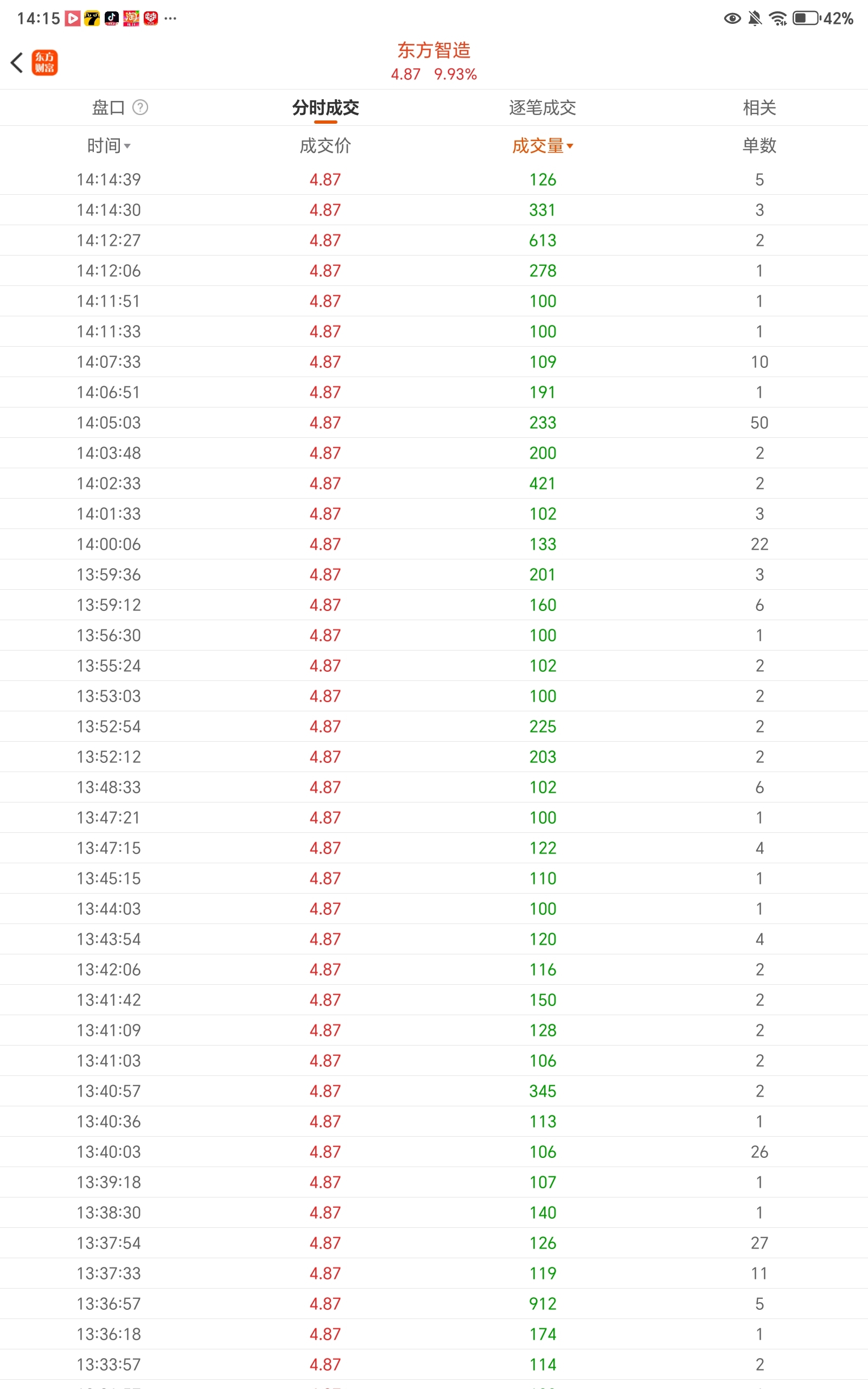 大单基本上不卖了!就有零星小单卖出!希望东方智造一遇风雨就化龙翱翔九天