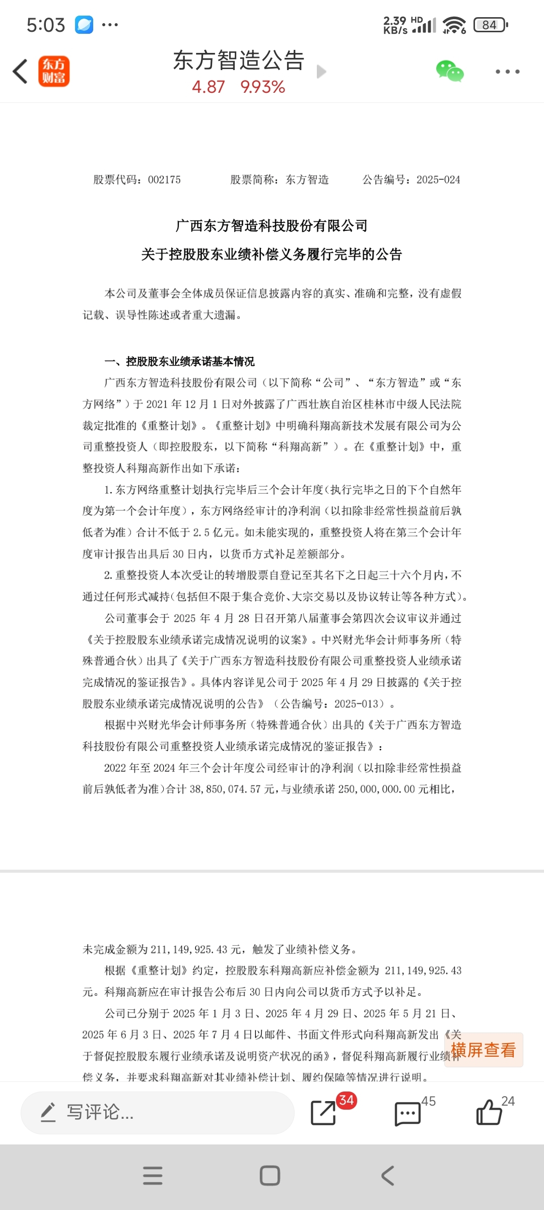 $东方智造(SZ002175)$ 2.1亿的业绩补偿承诺如期兑现不容易呀