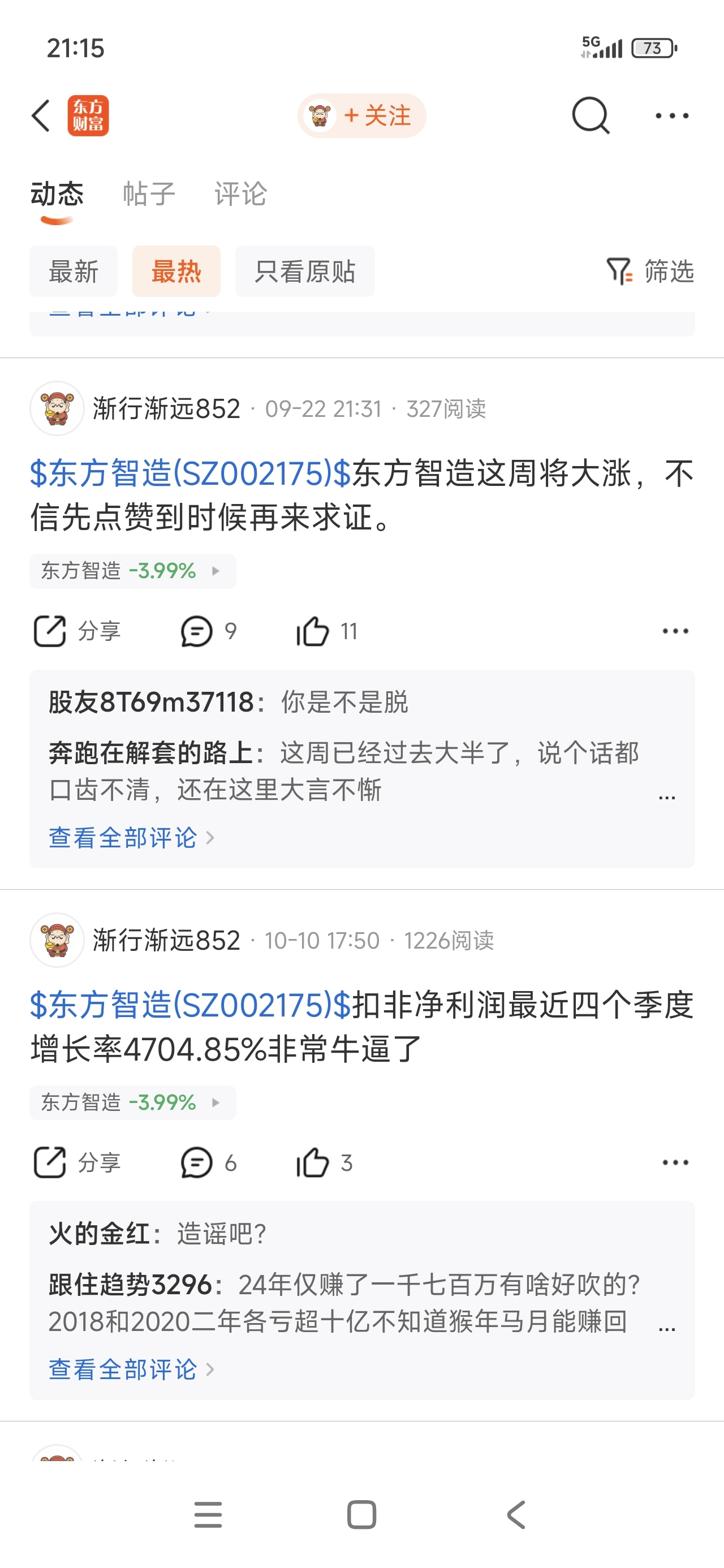 $东方智造(SZ002175)$ 当心这个人,是个拖,9.22号说大涨,结果大家自己看吧,直接拉黑
