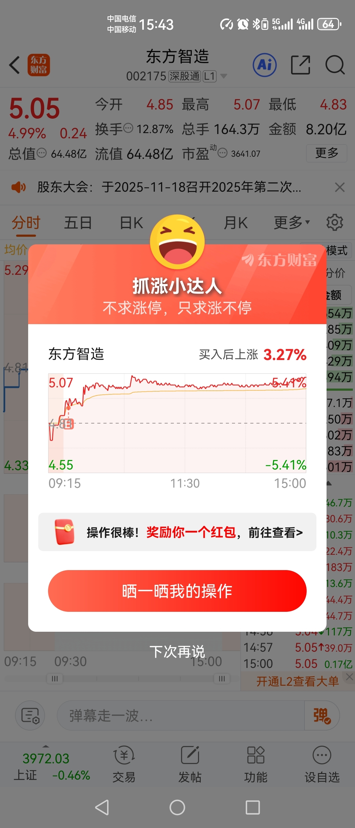 $东方智造(SZ002175)$ 希望明天有肉吃