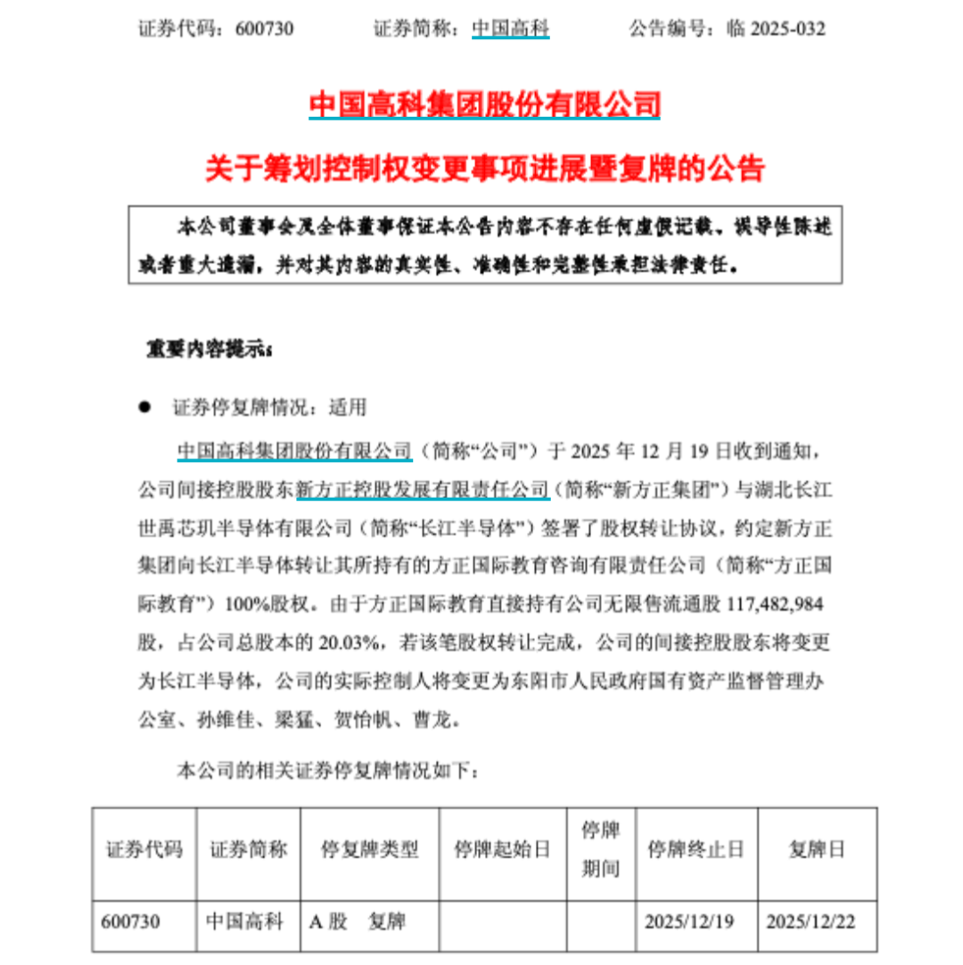 同日,中国高科也发布公告称,公司于2025年12月19日收到通知,公司间接控股股东新方正控股发展有限责任公司(简称“新方正集团”)与湖北长江世禹芯玑半导体有限公司(简称“长江半导体”)签署了股权转让协议,约定新方正集团向长江半导体转让其所持有的方正国际教育咨询有限责任公司(简称“方正国际教育”)100%股权。由于方正国际教育直接持有公司无限售流通股约1.17亿股,占公司总股本的20.03%,若该笔股权转让完成,公司的间接控股股东将变更为长江半导体,公司的实际控制人将变更为东阳市人民政府国有资产监督管理办公室、孙维佳、梁猛、贺怡帆、曹龙。