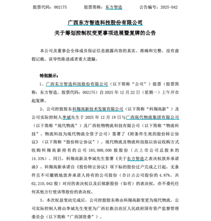 东方智造公告显示,公司控股股东科翔高新技术发展有限公司(以下简称“科翔高新”)及公司实际控制人李斌先生于2025年12月19日与广西现代物流集团有限公司(以下简称“现代物流”)及广西桂物物流科技有限公司(以下简称“物流科技”,物流科技为现代物流全资子公司)签署了《附条件生效的股份转让协议》(以下简称“股份转让协议”),现代物流及物流科技拟以协议收购方式收购科翔高新持有的公司1.83亿股股份(占上市公司总股本的14.33%)。同日,科翔高新及李斌先生签署《关于东方智造之表决权放弃承诺函》,科翔高新承诺自《股份转让协议》项下标的股份过户完成之日起,无条件且不可撤销地放弃承诺人持有的公司股份(合计占公司股份的4.87%,共约6221万股)对应的表决权以及后续新股份(如有)的表决权,亦不委托任何其他方行使该等股份的表决权。
