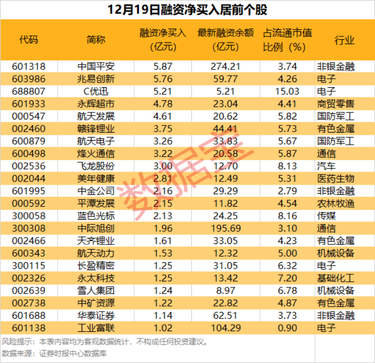 具体到个股,12月19日获融资净买入千万元以上的有398只,其中22只融资净买入额超亿元。中国平安融资净买入额居首,当日净买入5.87亿元,其次是兆易创新、C优迅,融资净买入金额分别为5.76亿元、5.21亿元,融资净买入金额居前的还有永辉超市、航天发展、赣锋锂业等。