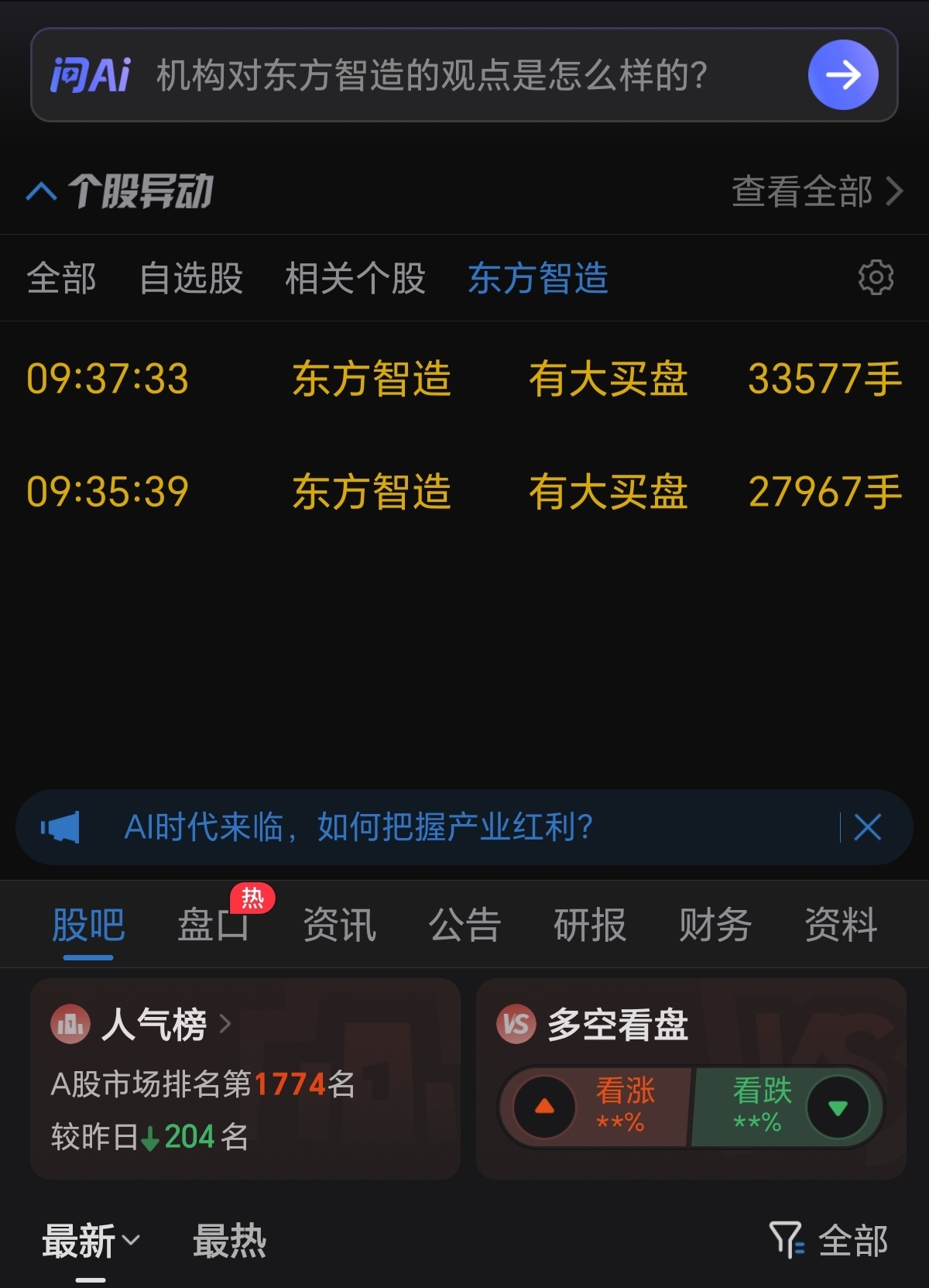 $东方智造(SZ002175)$ 只要我有这种大买盘就是跌,都是忽悠,如果红色的成交了那可能就涨了