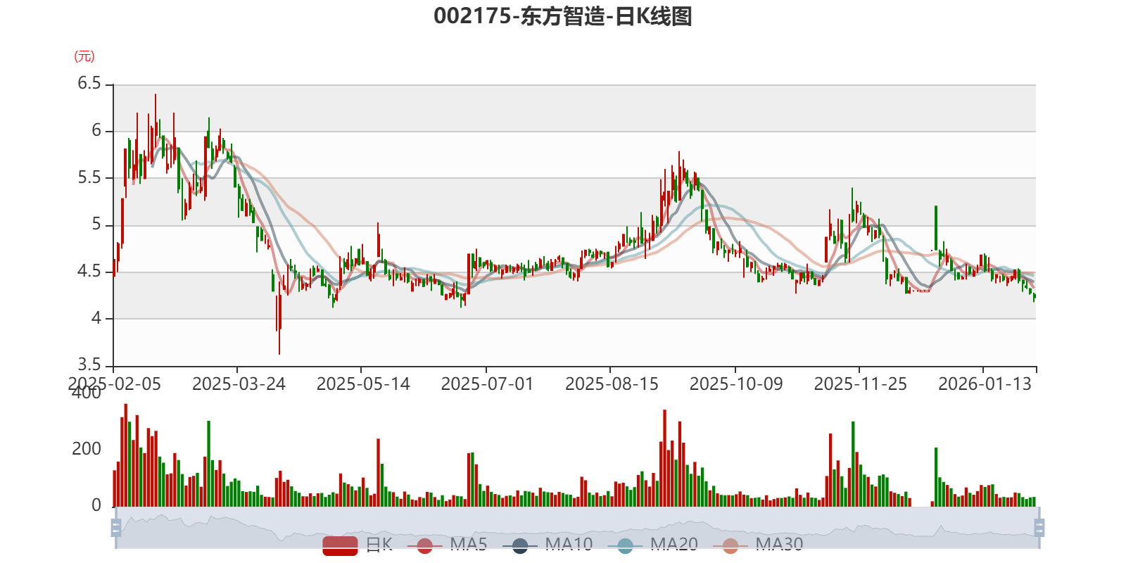 中证智能财讯东方智造(002175)1月30日晚间披露2025年度业绩预告,预计2025年实现营业收入3亿元至3.3亿元;归母净利润亏损2600万元至3900万元,上年同期盈利1661.25万元;扣非净利润亏损2600万元至3900万元,上年同期盈利1311.75万元;基本每股收益-0.02元/股至-0.03元/股。以最新收盘价计算,市净率(LF)约6.68倍,市销率(TTM)约17.15倍。