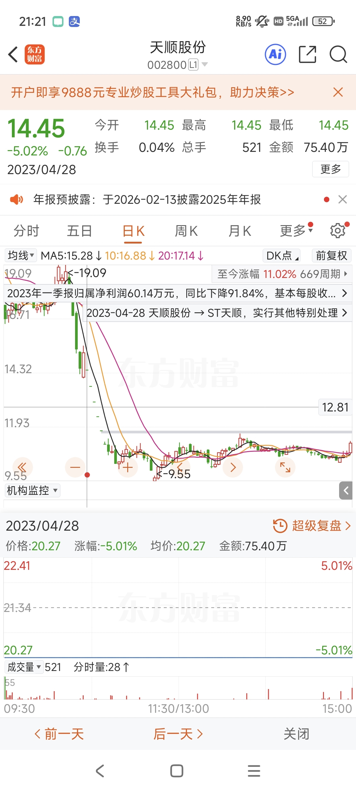$东方智造(SZ002175)$ 天顺股份新疆物流股,当时也炒国资收购,2023年4月突然因财务造假和收益问题被ST,六个跌停15块掉了30%,半年后回到13块以上,2年后回到15块,目前股价17块,供大家参考