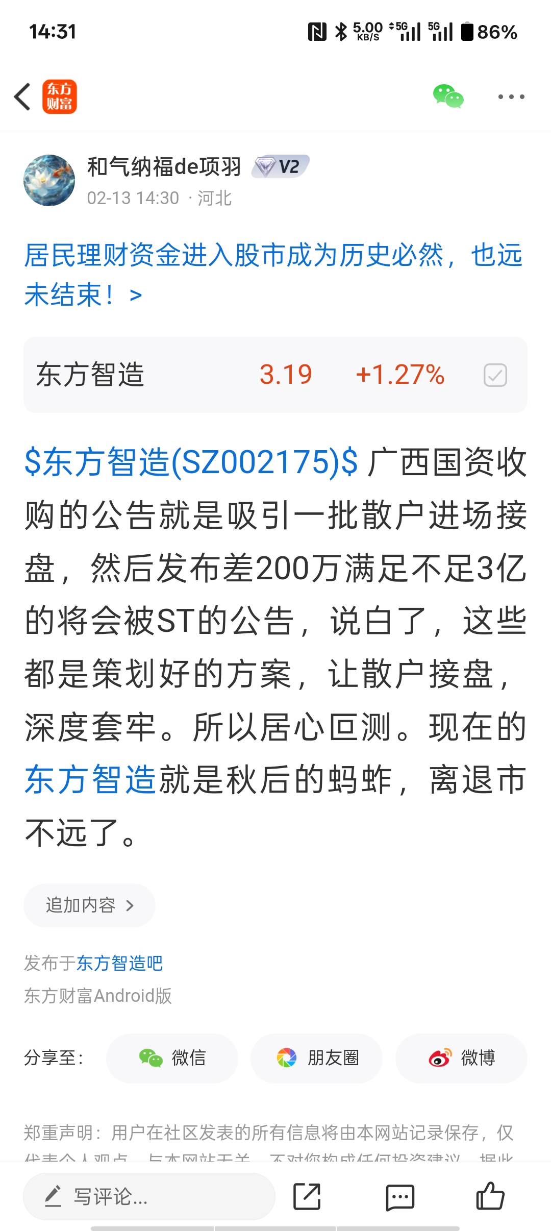 温馨提示: 1.根据《证券法》规定,禁止编造、传播虚假信息或者误导性信息,扰乱证券市场;2.用户在本社区发表的所有资料、言论等仅代表个人观点,与本网站立场无关,不对您构成任何投资建议。用户应基于自己的独立判断,自行决定证券投资并承担相应风险。《东方财富社区管理规定》