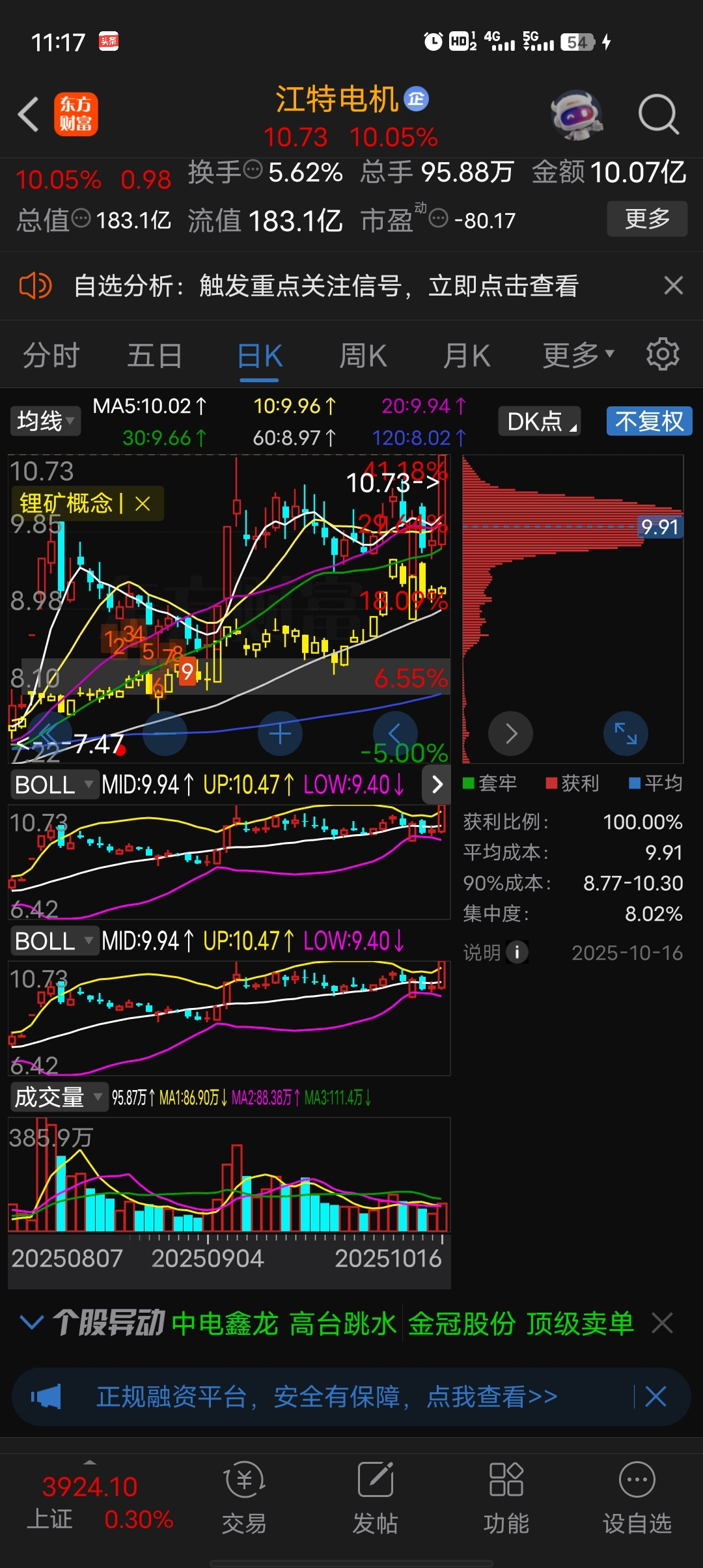 $江特电机(SZ002176)$ 获利比100%,说明什么,难道上方没套牢盘了,没压力了。