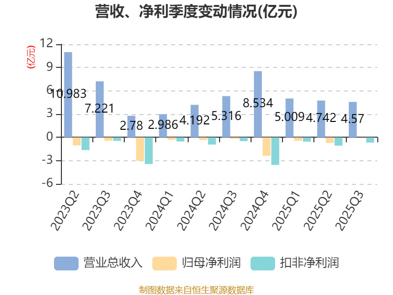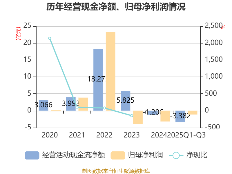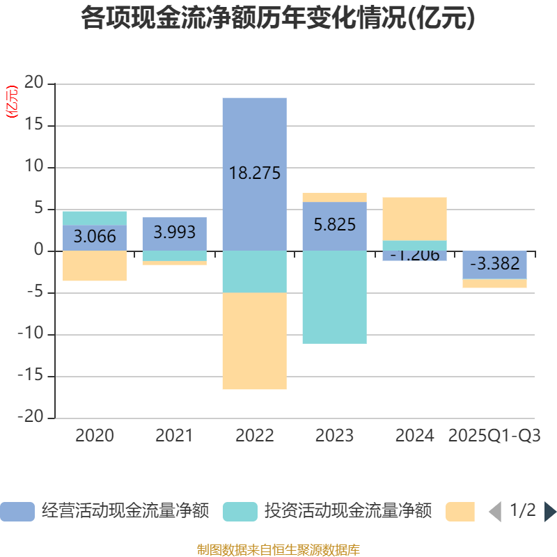 2025年前三季度,公司经营活动现金流净额为-3.38亿元,同比增加2.02亿元;筹资活动现金流净额-9984.7万元,同比减少4.39亿元;投资活动现金流净额-636.91万元,上年同期为2.41亿元。
