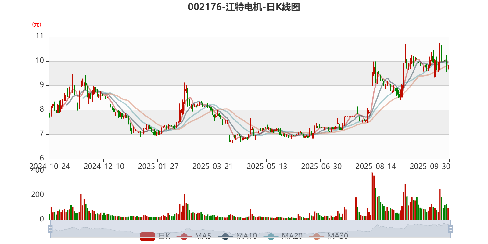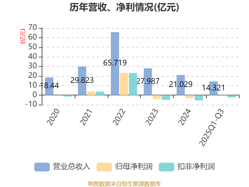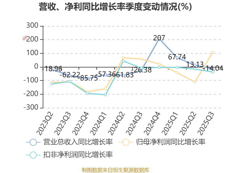 中证智能财讯江特电机(002176)10月24日披露2025年第三季度报告。前三季度公司实现营业总收入14.32亿元,同比增长14.62%;归母净利润亏损1.13亿元,上年同期亏损8223.06万元;扣非净利润亏损2.28亿元,上年同期亏损1.94亿元;经营活动产生的现金流量净额为-3.38亿元,上年同期为-5.4亿元;报告期内,江特电机基本每股收益为-0.0662元,加权平均净资产收益率为-3.27%。