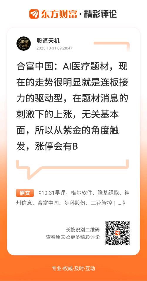 $江特电机(SZ002176)$$神州信息(SZ000555)$$福龙马(SH603686)$//@股道天机 :合富中国:AI医疗题材,现在的走势很明显就是连板接力的驱动型,在题材消息的刺激下的上涨,无关基本面,所以从紫金的角度触发,涨停会有B