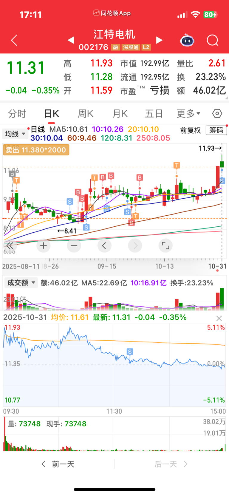 $江特电机(SZ002176)$ 早上看承接蛮强就没动 下午跌破早上最低点 实在忍不了 t了一点出去 算是把9月25日加的部分t出去了 等30分钟级别趋于缓和再接回来 这个位置实在感受不到高举高打的可能性 下午全是几十万小散单