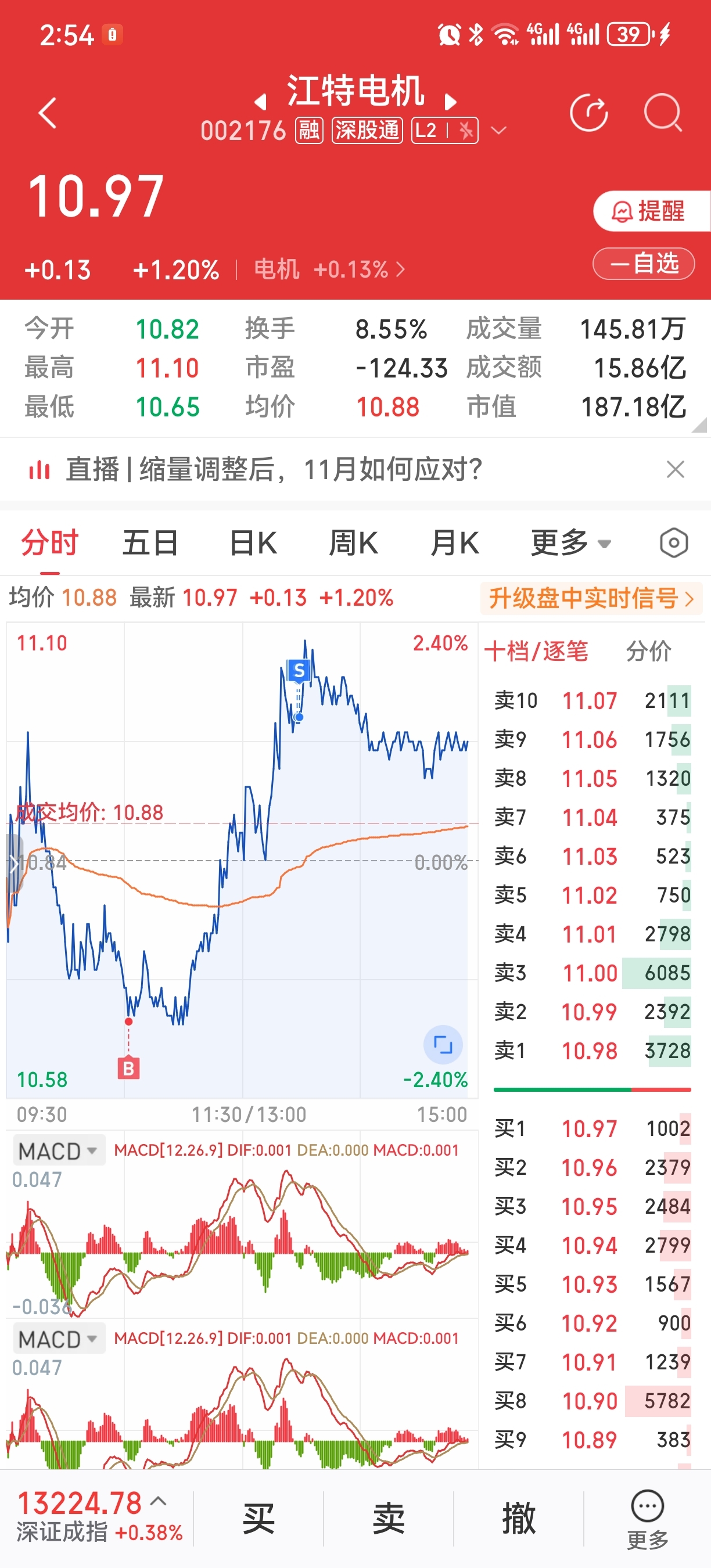 $江特电机(SZ002176)$ 虽然买卖都不是最佳点,但是还是很满足,谢谢给机会把昨天11.74进的卖掉了