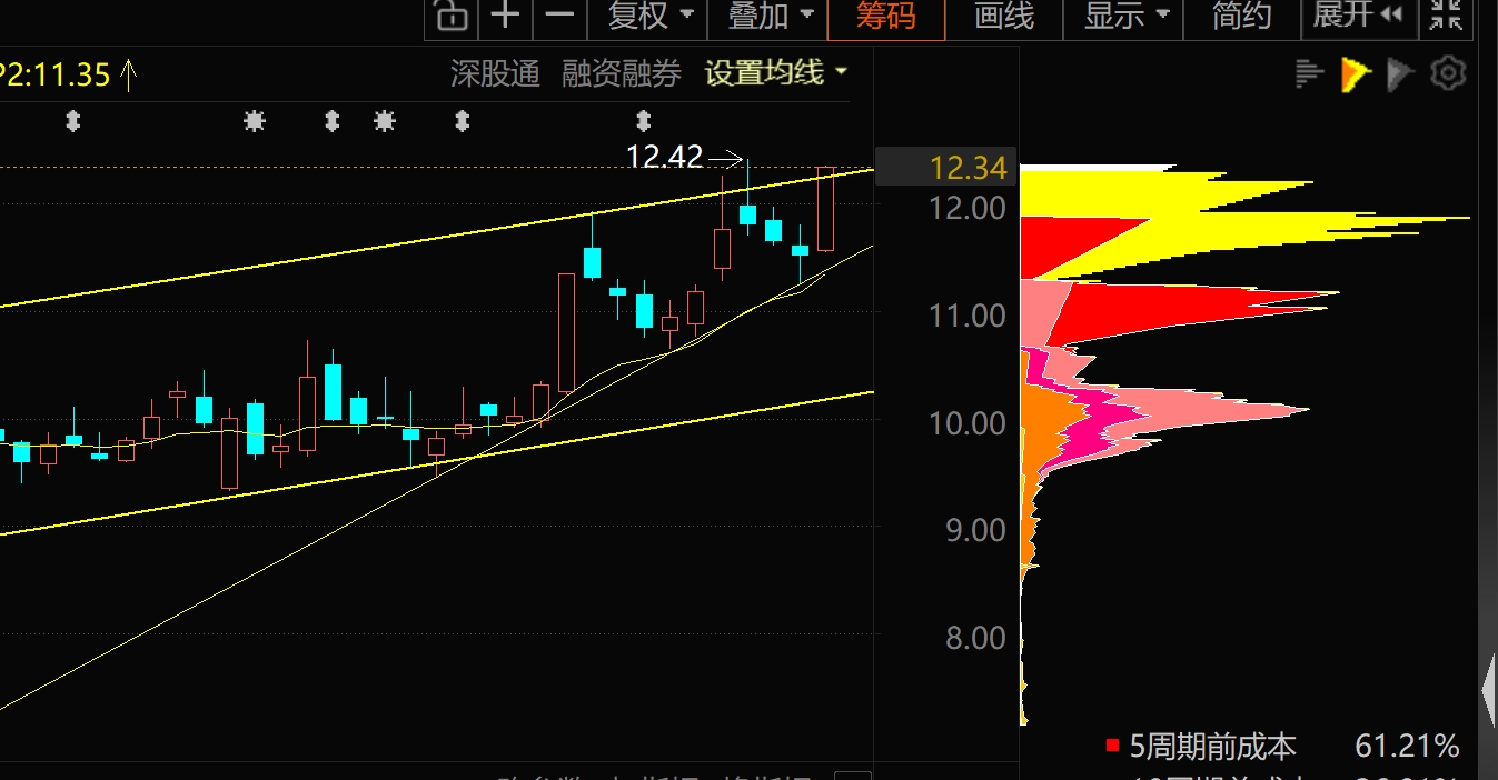 今日若放量突破12.42前高,收盘站稳12.3以上,则突破上行轨道,正式进入上涨