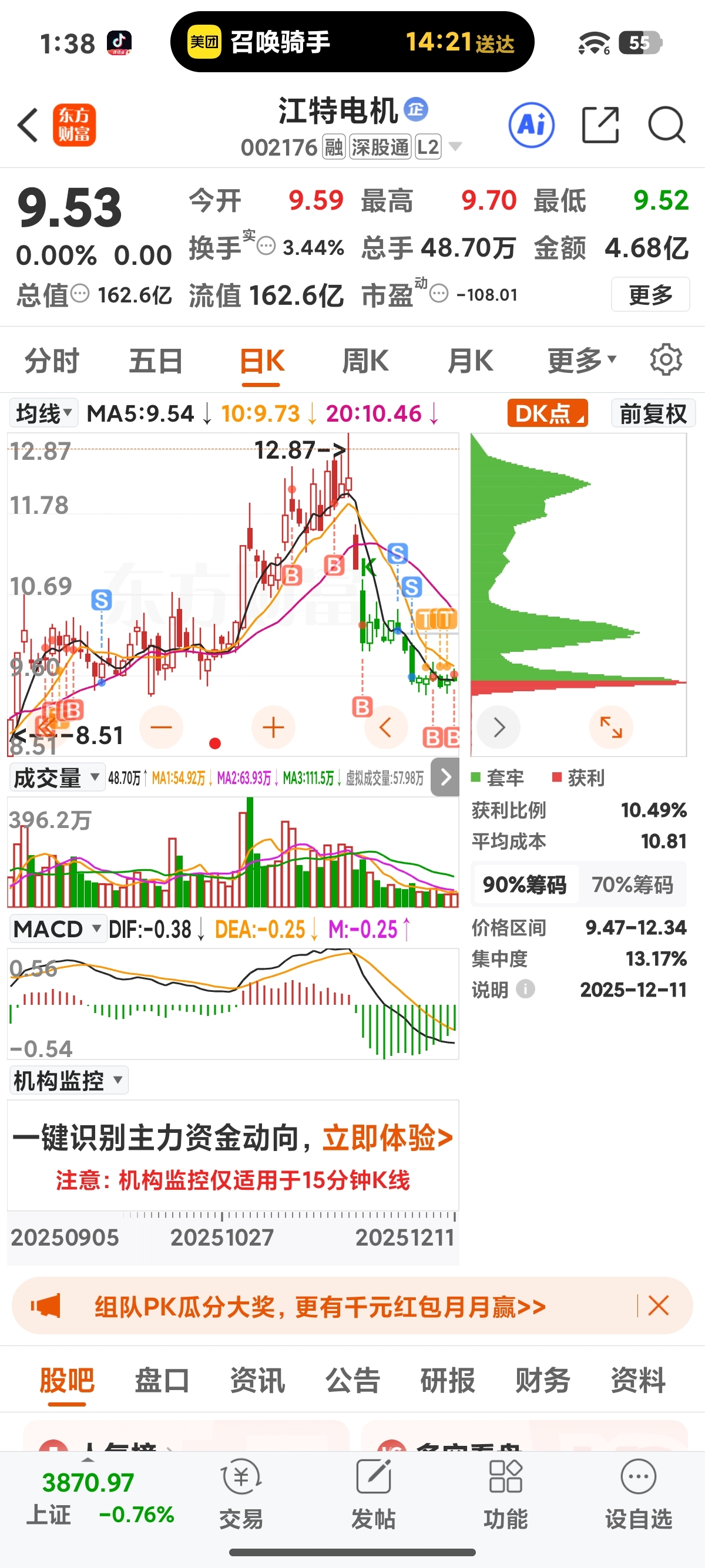 $江特电机(SZ002176)$ 虽然我也是从高位下来的,但是这种票很明显会磨很久,这几天基本也是震荡,虽然没涨,但是也没咋跌吧,怎么都是骂的,这几天你进去的不说盈利也没要你们吧(别骂,我也是被套的,下面是昨天的图)