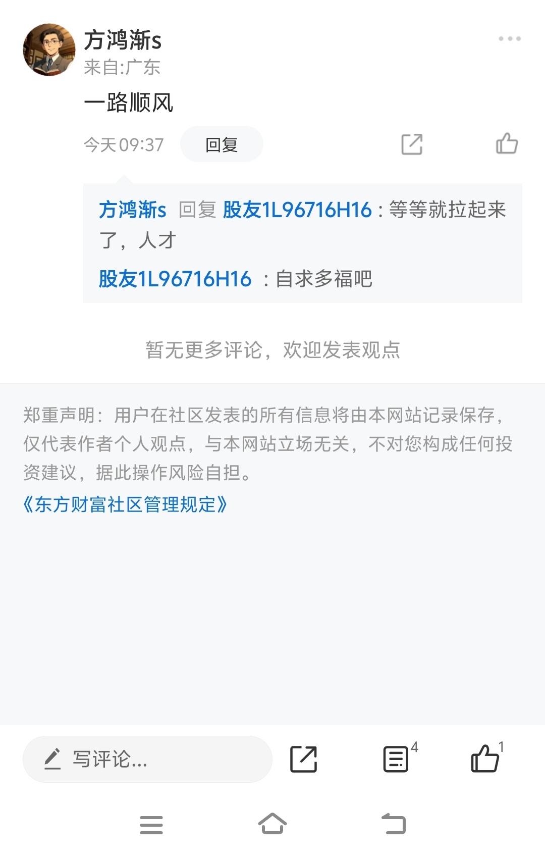 温馨提示: 1.根据《证券法》规定,禁止编造、传播虚假信息或者误导性信息,扰乱证券市场;2.用户在本社区发表的所有资料、言论等仅代表个人观点,与本网站立场无关,不对您构成任何投资建议。用户应基于自己的独立判断,自行决定证券投资并承担相应风险。《东方财富社区管理规定》