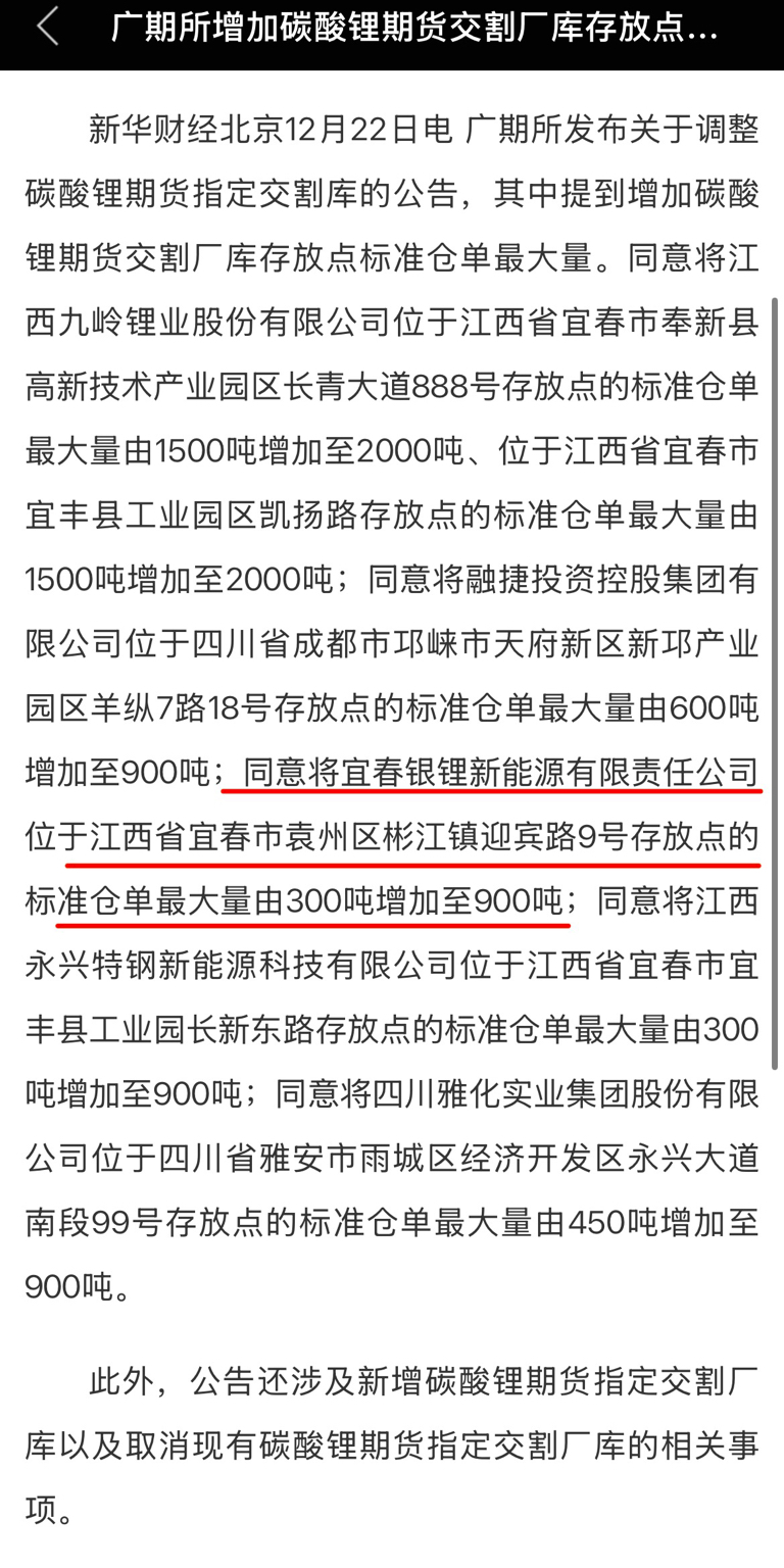1. 旗下宜春银锂的碳酸锂期货交割仓单最大量从300吨提升至900吨,交割额度翻倍,能增强公司在碳酸锂期货市场的话语权与定价权,也便于通过期货套保锁定利润、降低价格波动风险。