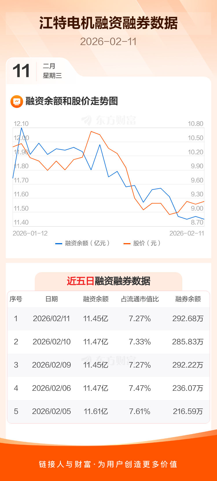 交易所最新数据显示,江特电机于2026年2月11日获融资买入1862.92万元,融资偿还2025.27万元,当日融资净偿还162.35万元。目前,该股融资余额11.45亿,占流通市值比例为7.27%。