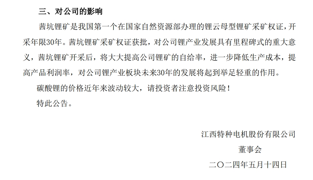 茜坑锂矿生产出矿在即,出矿后的作用有多大?请看公司公告.