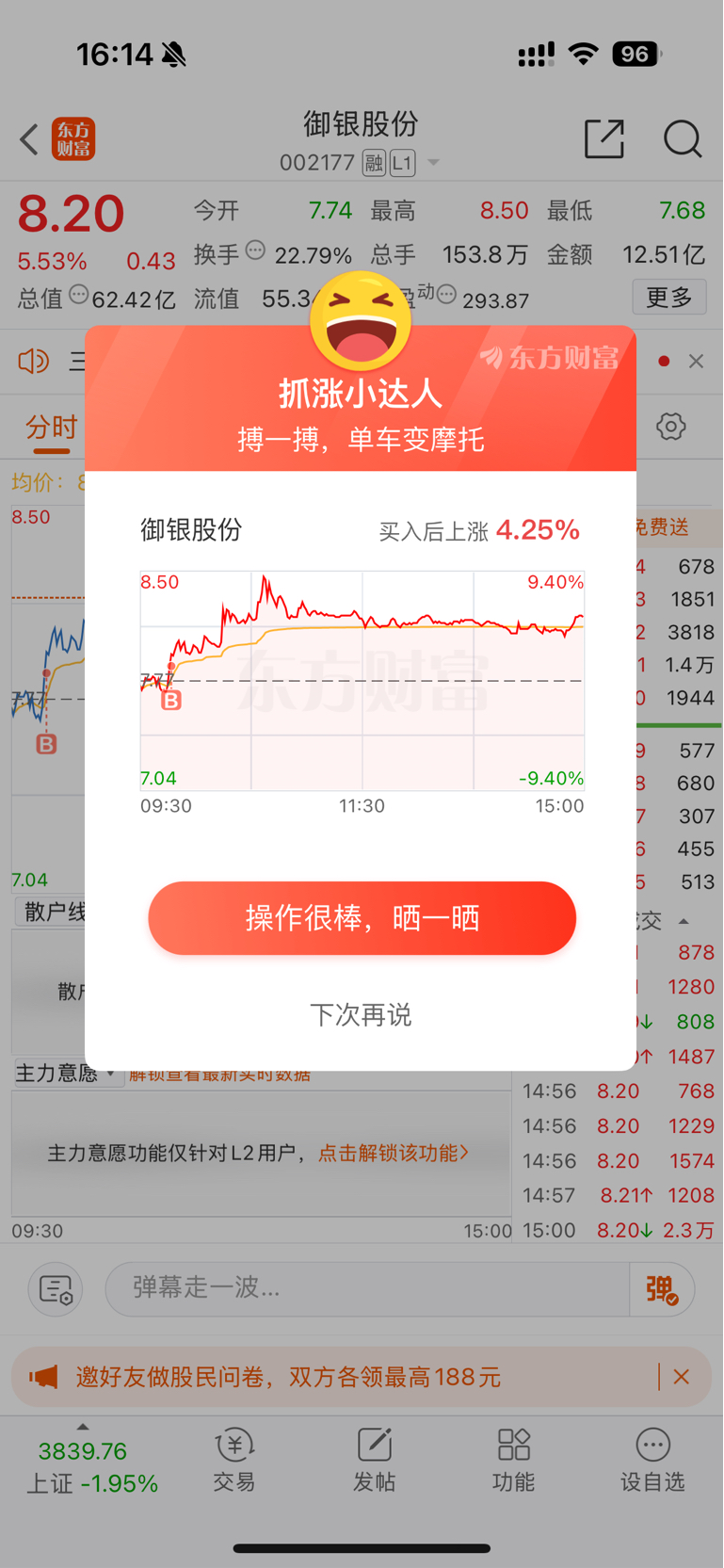 $御银股份(SZ002177)$ 唉9个点的时候没走,真是因小失大了