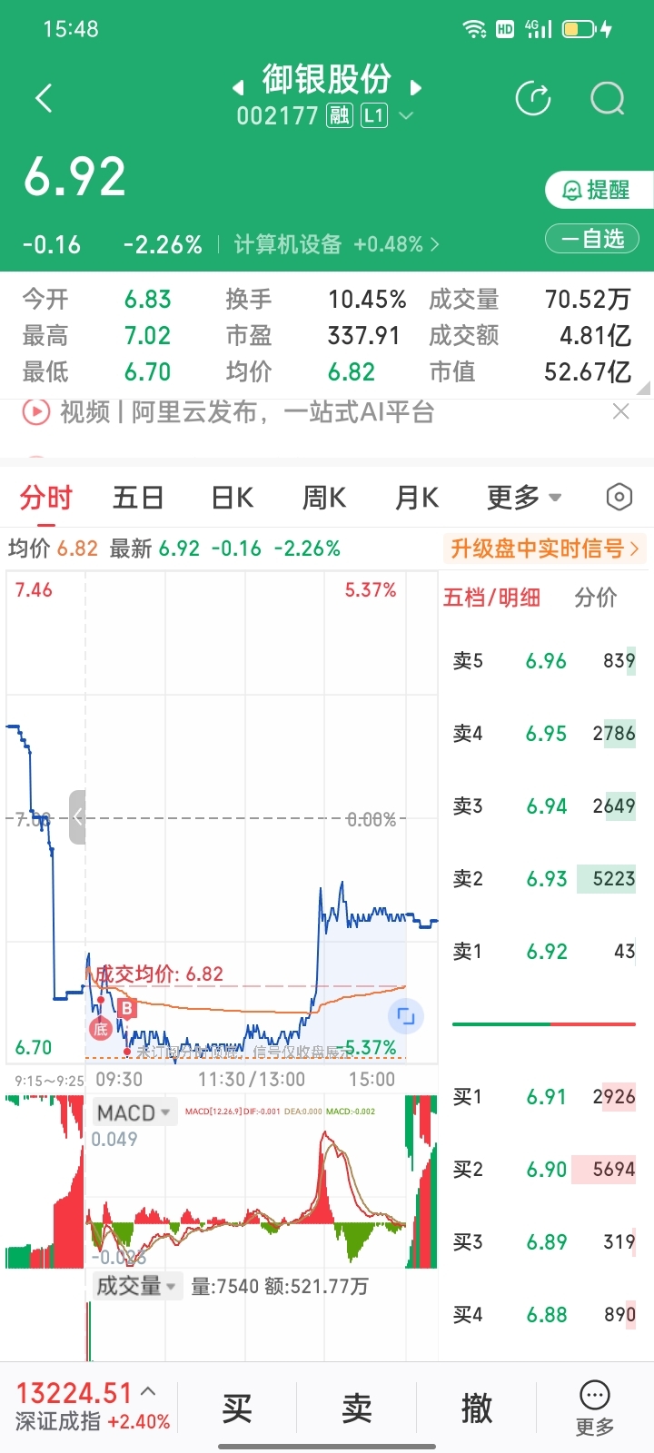 $御银股份(SZ002177)$ 早盘6.71买的,挣了3个点,明天平开高开就走。