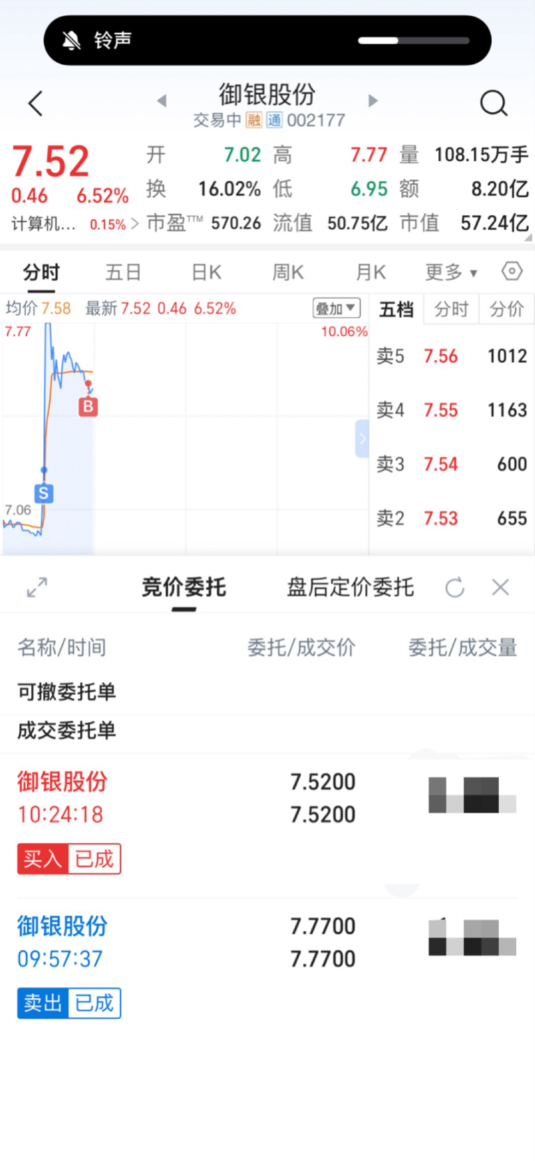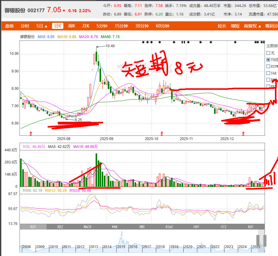 御银短期看多8元不变!坚持自己的交易系统。今天的目标13.5个点。