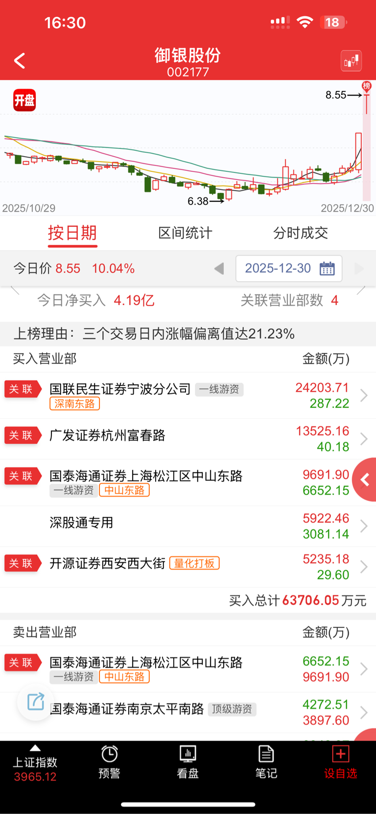 $御银股份(SZ002177)$ 买一和买二是同一个人,小票买了3个多亿,不打出辨识度根本出不了货,就比如他买的海南发展,华菱电线,都是有辨识度,有逻辑的,大手笔买入,等有人接盘才会卖出