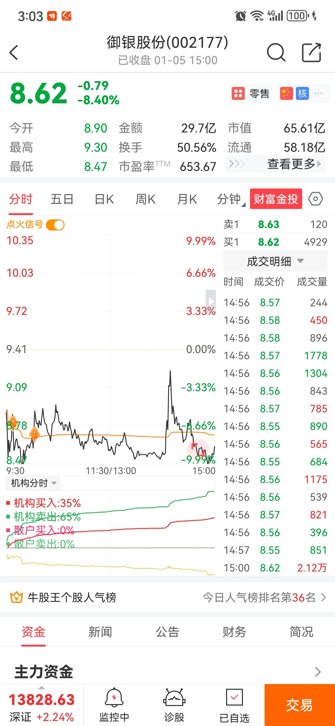 $御银股份(SZ002177)$ 看到你盘中拉升,机构买入比小于50%,就知道你是拉高出货,那我也跟着做T好了,卖在了次高点9.16,可以了。本来买了你是奔着连板的……可惜
