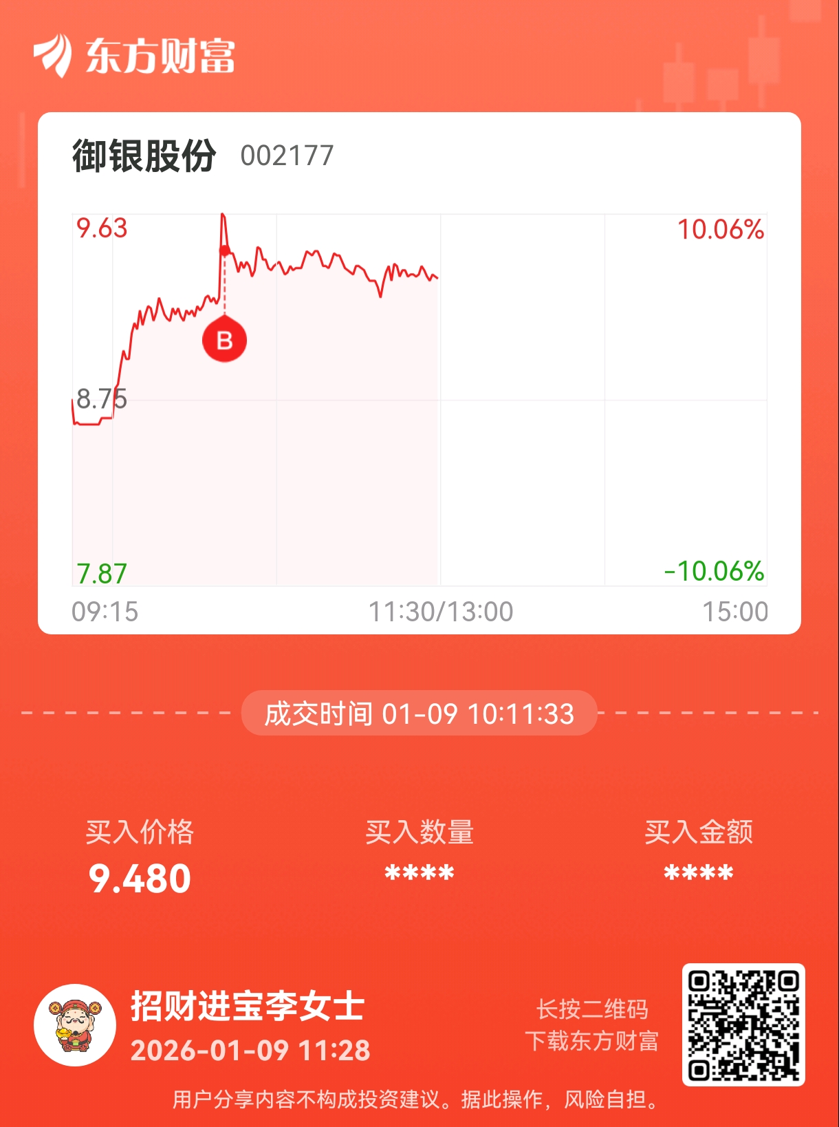 $御银股份(SZ002177)$ 怪我太贪心