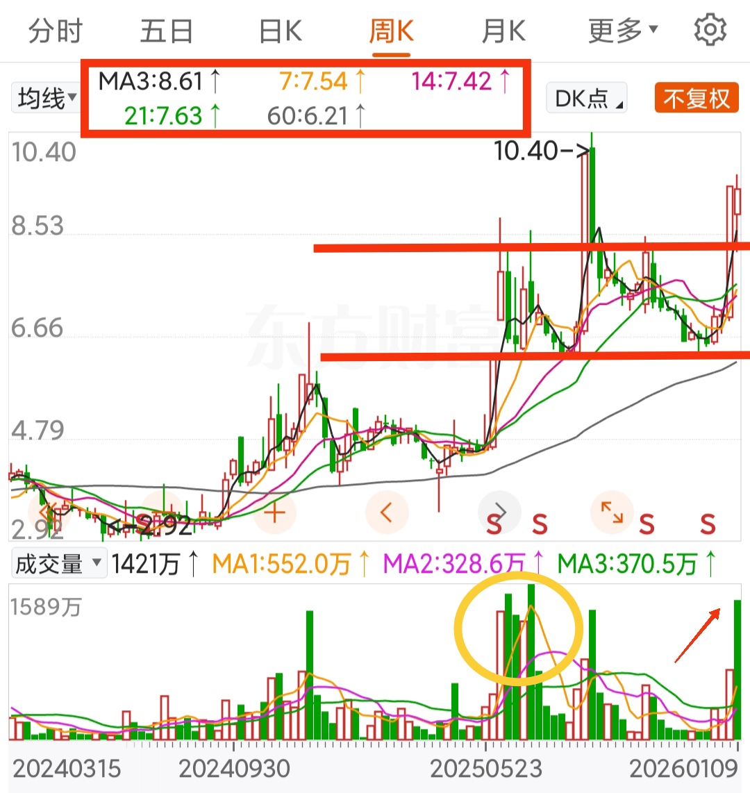 下周继续关注量能的配合程度,以及10.4-10.6的压力线。