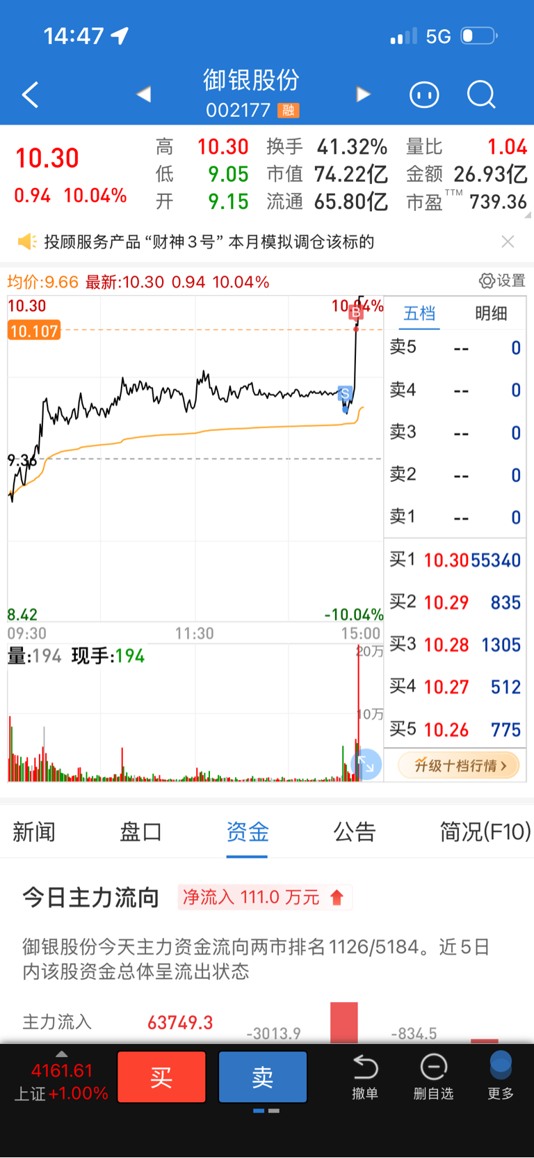 $御银股份(SZ002177)$ 跳水的时候把我洗下车,拉起来的时候又上车,今天一点利润都没,这主力太狠了