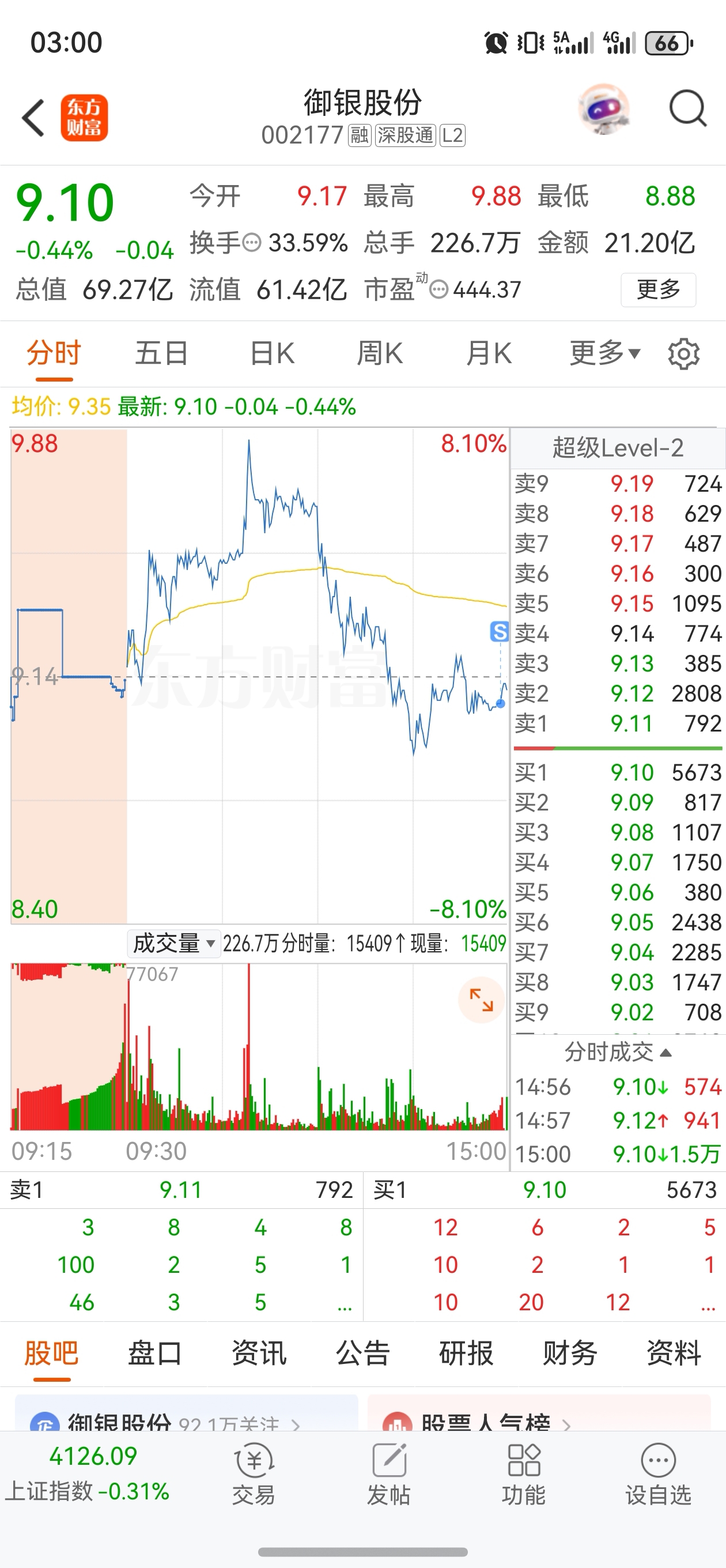 $御银股份(SZ002177)$ 尾盘全清~下跌行情开启,祝里面的兄弟保重