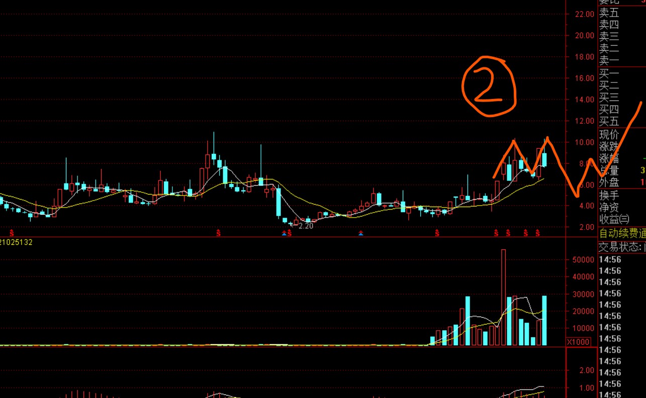2:月下向下挖坑,时间较长,坑度很深,跌幅50%左右,这是散户最难的一种方式。相当于2.2到10元的回调2浪。图2