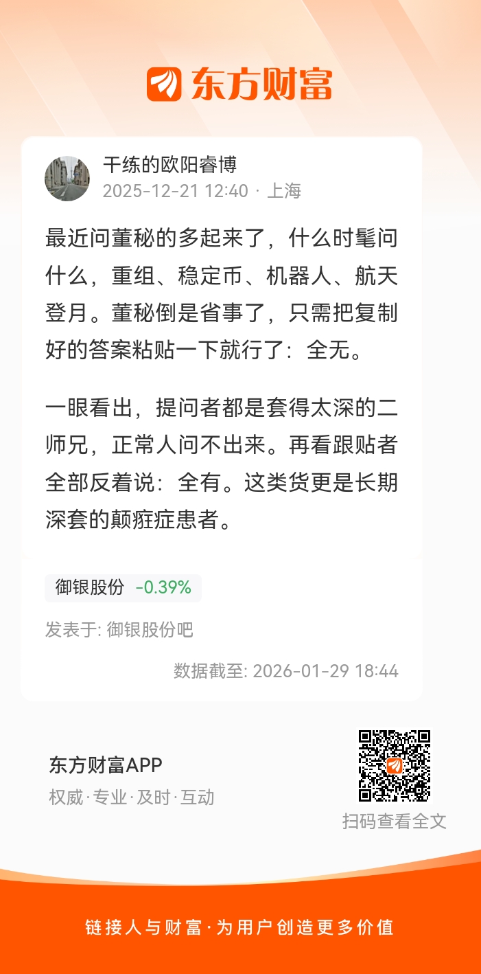 最近问董秘的多起来了,什么时髦问什么,重组、稳定币、机器人、航天登月。董秘倒是省事了,只需把复制好的答案粘贴一下就行了:全无。