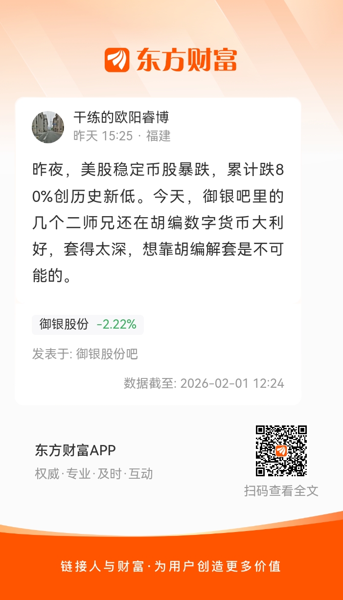 昨夜,美股稳定币股暴跌,累计跌80%创历史新低。今天,御银吧里的几个二师兄还在胡编数字货币大利好,套得太深,想靠胡编解套是不可能的。