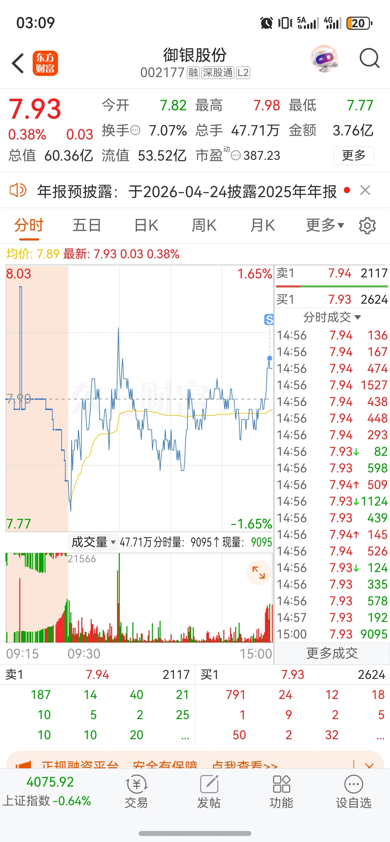 $御银股份(SZ002177)$ 尾盘下车!等明天大阴线我再回来!