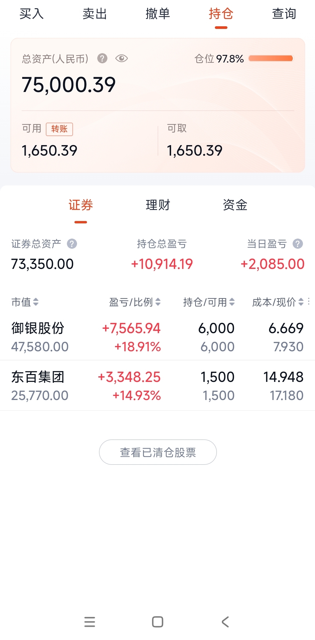新手宝妈,挪子金库,9万入市,勇闯大A。实盘交易第140天,今日盈利2085元。今日持有御银股份和东百集团。